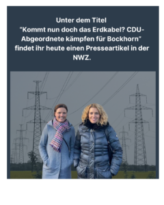BOCKHORN. (jos) Mit einem offenen Brief wenden sich die CDU-Politikerinnen Anne Janssen (MdB) und Katharina Jensen (MdL) jetzt an die Landesregierung in Hannover: Es geht den beiden unter anderem auch um die friesländische Gemeinde Bockhorn, denn genau dort soll die neue Stromtrasse „Wilhelmshaven2-Conneforde“ (WiCo2) als Oberlandleitung durch das Wohngebiet „Am Urwald“ verlaufen. Die Anwohner haben sich in der Vergangenheit vehement gegen das Vorhaben gewehrt und bereiten – wie berichtet – ein Klageverfahren gegen den Netzbetreiber Tennet vor, der die Leitung bauen soll.