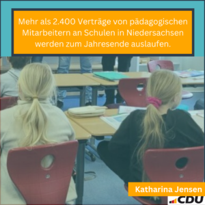 Gut 2.400 Verträge von pädagogischen Mitarbeitern an Schulen in Niedersachsen werden zum Jahresende auslaufen. Die Stellen waren Teil des von der Großen Koalition aus SPD und CDU eingeführten Programms „Startklar in die Zukunft“, mit dem das Land die Folgen der Corona-Pandemie abmildern wollte sowie Stellen, die im Rahmen der Integration von Flüchtlingen nach Beginn des russischen Angriffskriegs auf die Ukraine geschaffen wurden. Dieses Thema setzte die CDU-Fraktion im Niedersächsischen Landtag daher als Dringliche Anfrage auf die Tagesordnung des jüngsten Plenums.